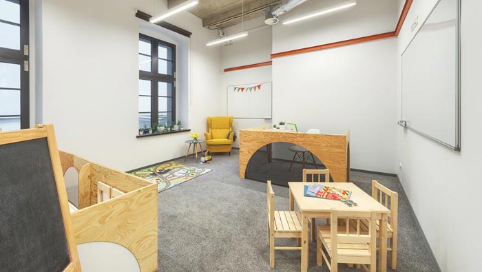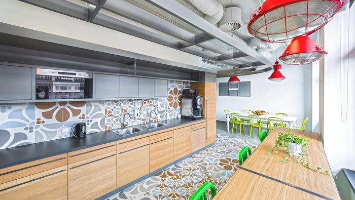 茶水間的設(shè)計:設(shè)計師在設(shè)計的時候,將茶水間與休息區(qū)域很好的融合在一起,茶水間與休息區(qū)域的設(shè)計完全都是倚邊而建,這樣的設(shè)計反而將中央?yún)^(qū)域保留了下來,這條線在設(shè)計師眼中是一塊天然的動線,去中心化的設(shè)計也解決了空間的動線問題。