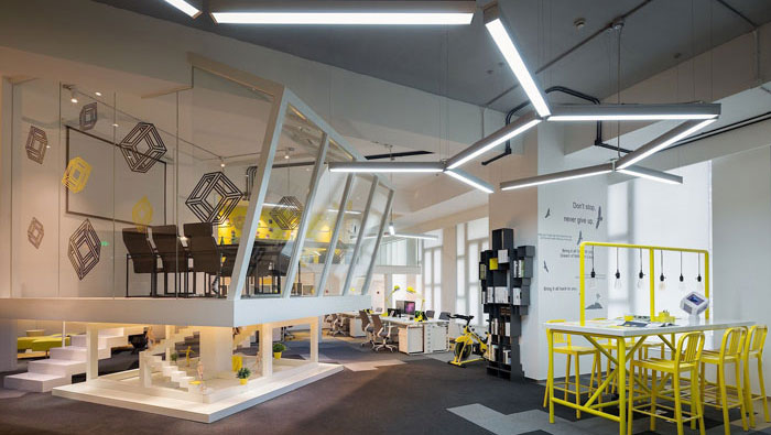 整個(gè)辦公區(qū)域的設(shè)計(jì),特色就是凌駕于整個(gè)空間的區(qū)域loft設(shè)計(jì),四周空間成拱衛(wèi)之勢,以此說明討論、創(chuàng)新對企業(yè)發(fā)展的重要性。