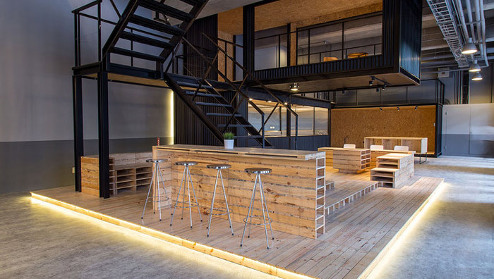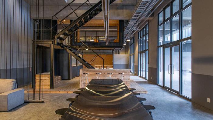 LOFT風(fēng)格辦公室大廳設(shè)計(jì):在辦公室一樓設(shè)計(jì)中,設(shè)計(jì)師基本上采用的都是輔助性設(shè)計(jì),例如接待區(qū)、吧臺區(qū)、休息區(qū),樓梯曲折向上讓人對上部空間產(chǎn)生好奇,一樓的設(shè)計(jì)也為企業(yè)接待客戶提供各種可能。