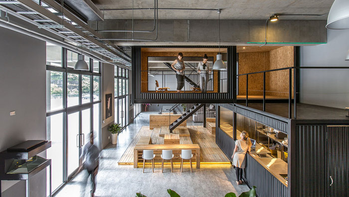 LOFT風(fēng)格辦公室設(shè)計(jì):在這里可以清楚的看到一樓、二樓的關(guān)系,員工可以隨自己的喜歡挑選辦公場所,一樓抬頭就可以看到二樓,二樓低頭就可以看到一樓,相互之間的交流不會因?yàn)闃菍拥淖韪羰艿浇z毫影響。
