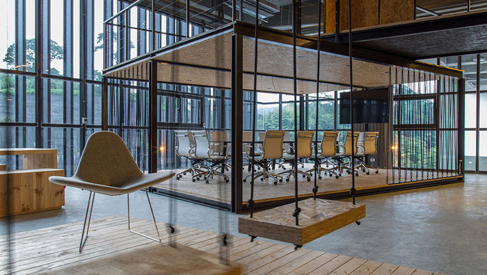 LOFT風(fēng)格辦公室會議室設(shè)計(jì):會議室位于一樓的邊緣,在這里不會占用空間的主流空間,同時此處也十分安靜,十分適合會議的開展,四面透風(fēng)也讓會議室少了很多束縛,讓員工在會議中可以暢所欲言。
