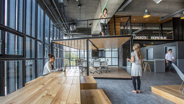 LOFT風(fēng)格辦公室進(jìn)門區(qū)設(shè)計(jì):物流公司的業(yè)務(wù)主要就是取與送,所以在先天上就會十分在意路線的構(gòu)建,整個空間也同樣如此,設(shè)計(jì)師通過上下結(jié)構(gòu)的錯差,讓空間在錯落之間尋求一種平衡。