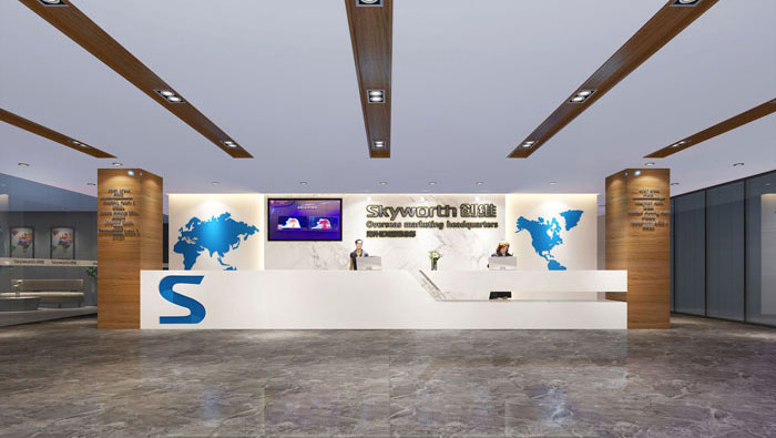 前臺(tái)的設(shè)計(jì),設(shè)計(jì)師采用聚中的設(shè)計(jì)手法,將前臺(tái)固定在空間中央,一則起到強(qiáng)調(diào)的作用,二則利于居中的手法將企業(yè)形象加以延伸,以達(dá)到多次強(qiáng)調(diào)的作用。