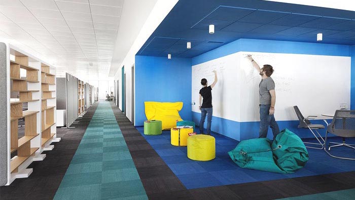 辦公大廳的設計:此處的大廳指的是對整個辦公空間進行平視之后的結果,設計師在設計的時候,以簡潔的空間為原型,在其中加入了各種各樣的創(chuàng)意元素,設計師希望員工可以不受阻隔的在空間中自由思考,設計師將空間的阻隔完全打破,讓員工在此處可以自由又自在,在其中尋求那捉摸不定的靈感。