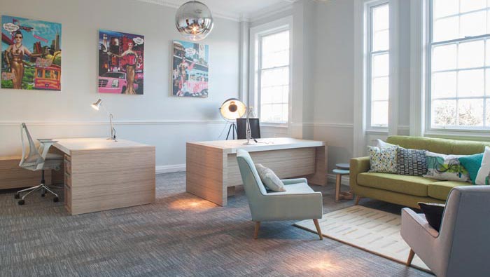 接待區(qū)域的設計:此處位于前臺與樓梯的過渡空間之中,客戶經過前臺在此處休息和洽談,起到空間與空間的過渡作用,同時讓客戶對整個空間有一個大致了解,不會覺得突兀,接待處對客戶的信息進行記錄之后,與二樓進行對接,也保證了工作的效率得以提升。
