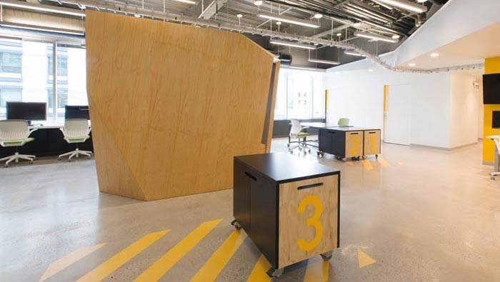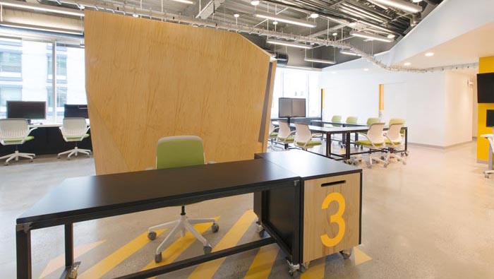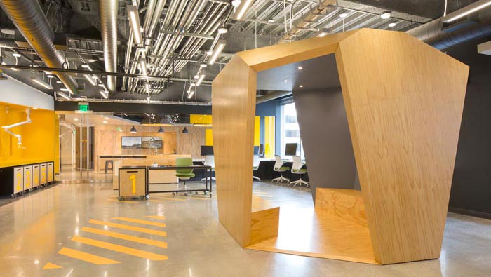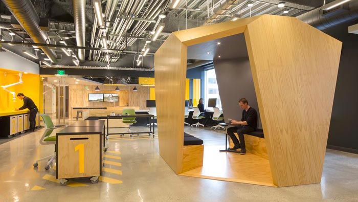 辦公區(qū)域的設(shè)計:此時員工已然進入其中開始辦公,其中最大的亮點就是每一個家具是可以動的,不是一成不變的,不要小看一個小小的轱轆,它帶來的是一個變化的空間,根據(jù)研究人在一個地方呆的時間過長,往往會有壓抑創(chuàng)新的能力,因為已然麻木不堪,這是研究開發(fā)的大忌,所以設(shè)計師要保持空間時時刻刻的變化。