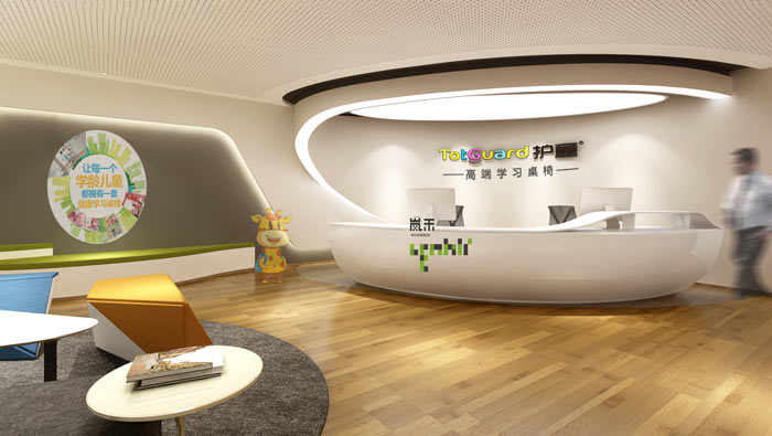 科技公司辦公室前臺設(shè)計:護(hù)童——高端學(xué)習(xí)桌椅,設(shè)計師以文字的融合達(dá)到讓客戶,在第一時間了解企業(yè)的屬性,讓每一個學(xué)齡兒童都擁有一套健康的學(xué)習(xí)桌椅,代表了企業(yè)產(chǎn)品開發(fā)的核心。