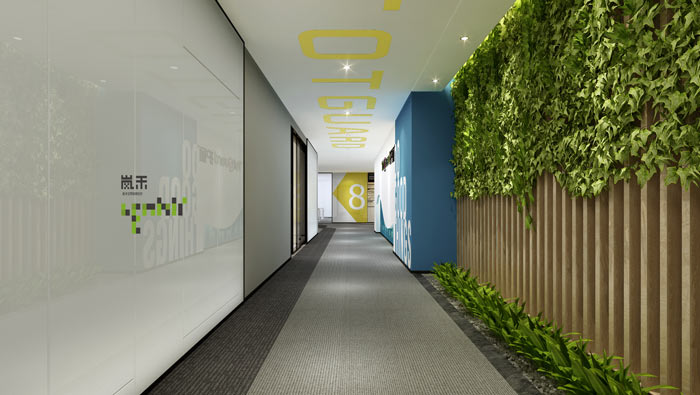 科技公司辦公室員工過道設(shè)計:公司一共有兩個門可以進(jìn)入,這里通俗點說就是后門,員工通過這里進(jìn)出空間,綠色、自然的設(shè)計,是設(shè)計師希望讓員工每天都有一個好心情。