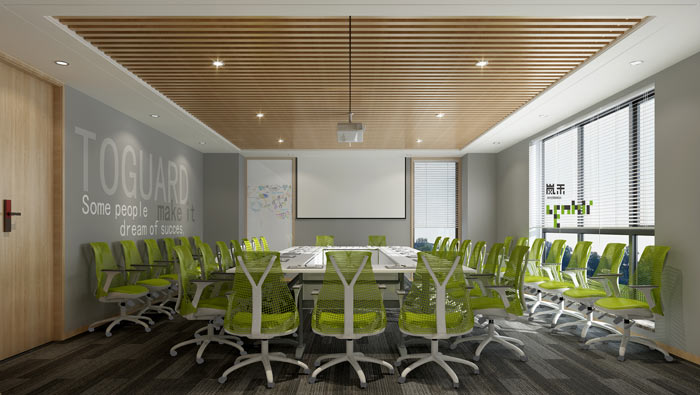 科技公司辦公室會議室設(shè)計:設(shè)計就是要分清輕重緩急,在這個空間內(nèi)會議是前提,所以會議桌椅是重中之重,設(shè)計師在會議桌椅之外又?jǐn)[放了一層會議椅,目的就是增加空間的容納能力。