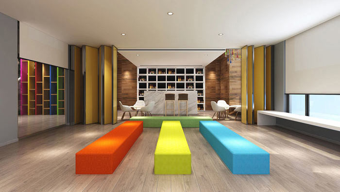前臺區(qū)域的設(shè)計,設(shè)計師在設(shè)計的時候,為了化解受限的空間,設(shè)計師利用樓梯的鋪設(shè)將空間引入空中,利用左右兩側(cè)的入口在視覺上讓人忽略空間自身的面積。