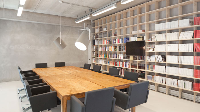 現(xiàn)代簡約辦公室會(huì)議室設(shè)計(jì):此處辦公桌椅在中、一邊有書架相伴、上方都射燈,這是空間的大致格局,會(huì)議桌有四張單獨(dú)的桌子構(gòu)成可分可和,分則形成四個(gè)獨(dú)立的小型會(huì)議區(qū),合則形成一個(gè)大的會(huì)議區(qū),充分提升了空間的靈活性,分還有一個(gè)好處就是讓此處成為閱讀區(qū)域,讓員工在書籍的陪伴下不斷充實(shí)自己。