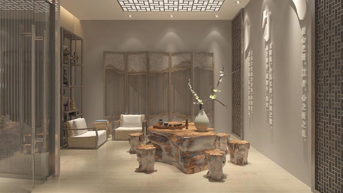 洽談區(qū)域的設(shè)計(jì):由于此處的空間屬性較為特殊,所以設(shè)計(jì)師在設(shè)計(jì)的時(shí)候,需要進(jìn)行充分的考慮,因?yàn)榇颂幮枰袚?dān)起洽談、交流、接待的作用,故此設(shè)計(jì)師與客戶商量之后決定采購(gòu)一套實(shí)木造型茶桌、茶椅,設(shè)計(jì)師希望以此改變空間的整體屬性,讓空間更趨向于待客之用。