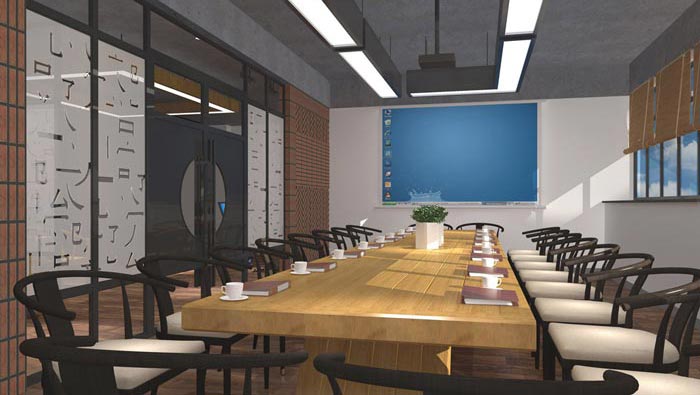 會(huì)議室的設(shè)計(jì):典型的中式會(huì)議桌與會(huì)議椅,除此之外別無(wú)他物,讓空間的中心更加明確,空間的正式性表現(xiàn)的淋漓盡致,動(dòng)線(xiàn)分布在四周保證空間的通暢性,采光的投射在一定程度上削弱了空間的正式性,矛盾的對(duì)立與矛盾的設(shè)計(jì)手法,見(jiàn)證了設(shè)計(jì)師在室內(nèi)辯證思維的運(yùn)用。