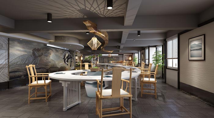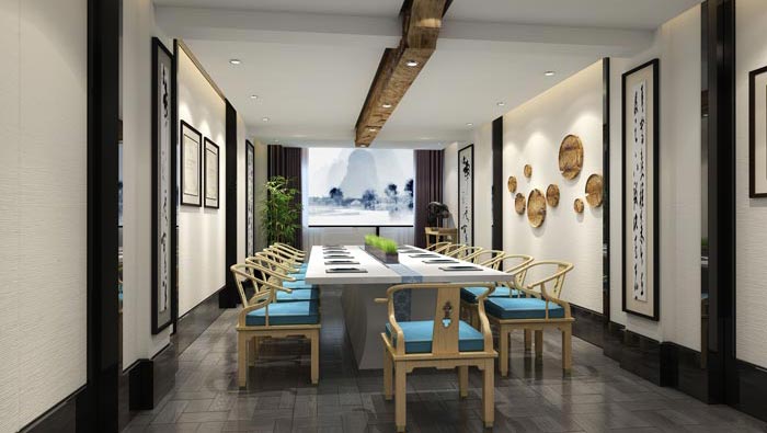會議室的設(shè)計:中式風(fēng)格本身就是古人對于自然的理解,也是古人對于為人處世具象化的一種表現(xiàn),故此設(shè)計師希望中式的布局可以為企業(yè)帶來一次心靈的升華,嚴(yán)謹(jǐn)?shù)目臻g布局、沉穩(wěn)的空間氛圍盡顯古人嚴(yán)謹(jǐn)?shù)淖黠L(fēng),設(shè)計師希望員工可以繼承中華文化的精髓,不斷自我成長、不斷在工作中尋求突破。