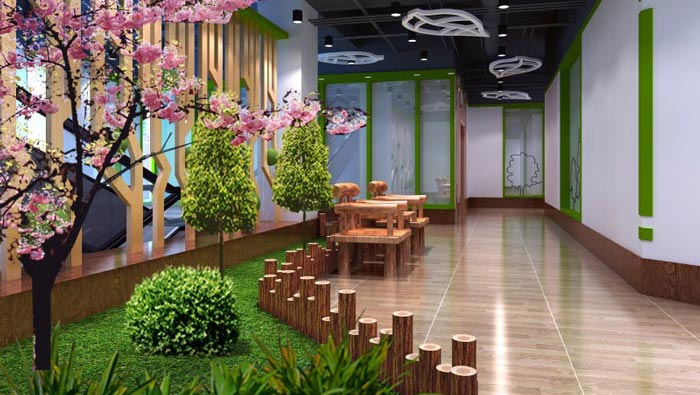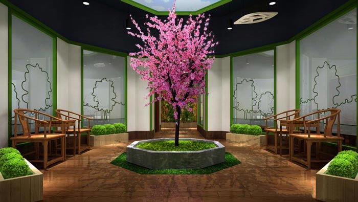 過(guò)道的設(shè)計(jì):此處有綠植、花草、木制柵欄可謂十分齊全,其中最引人關(guān)注的是那一顆含花待放的桃花,看到那花蕾媽紅小巧的桃花,給人的是一種觸動(dòng),不由自主的融入那花愫中,去感受桃花的生命,另外桃花粵語(yǔ)中“宏圖”與“紅桃”同音,桃花寓意“大展宏圖”。
