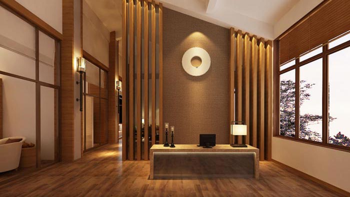 前臺的設(shè)計:空間本身是一個下沿式的空間,設(shè)計師在思索許久之后,覺得首先是要消除空間下沿的缺憾,在此基礎(chǔ)上設(shè)計師以隔斷自然向上的布局,來沖淡空間的下沿格局,化不利為有利,在過道處采用一個超過90度的角度來完成空間的節(jié)點,這樣既化解了下沿式的格局,也塑造了大氣、溫馨的空間格局。