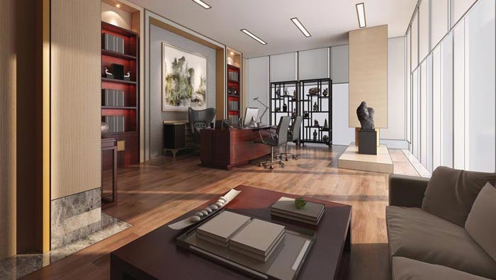 總經(jīng)理辦公室的設(shè)計:此處重點在于展現(xiàn)人與空間、物與空間、空間與自然之間的關(guān)系,其中中式后現(xiàn)代家具以其優(yōu)美的線條,多變的曲線,靈秀的圖案,點到為止的制作技藝,在加上符合現(xiàn)代人需求的時尚元素和個性化,令審美視線不斷跳躍,古樸和時尚融為一體。