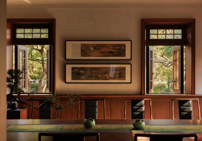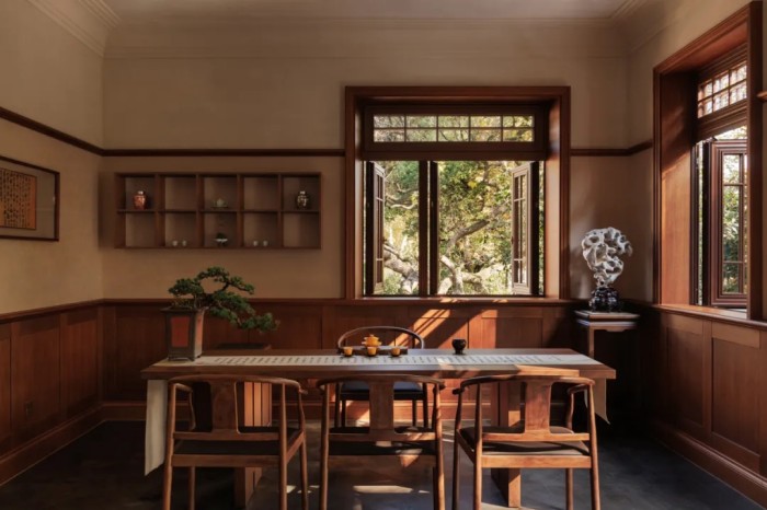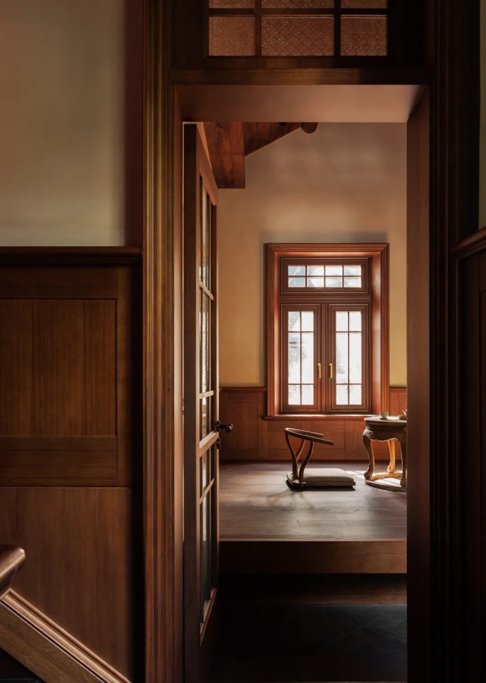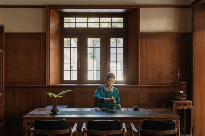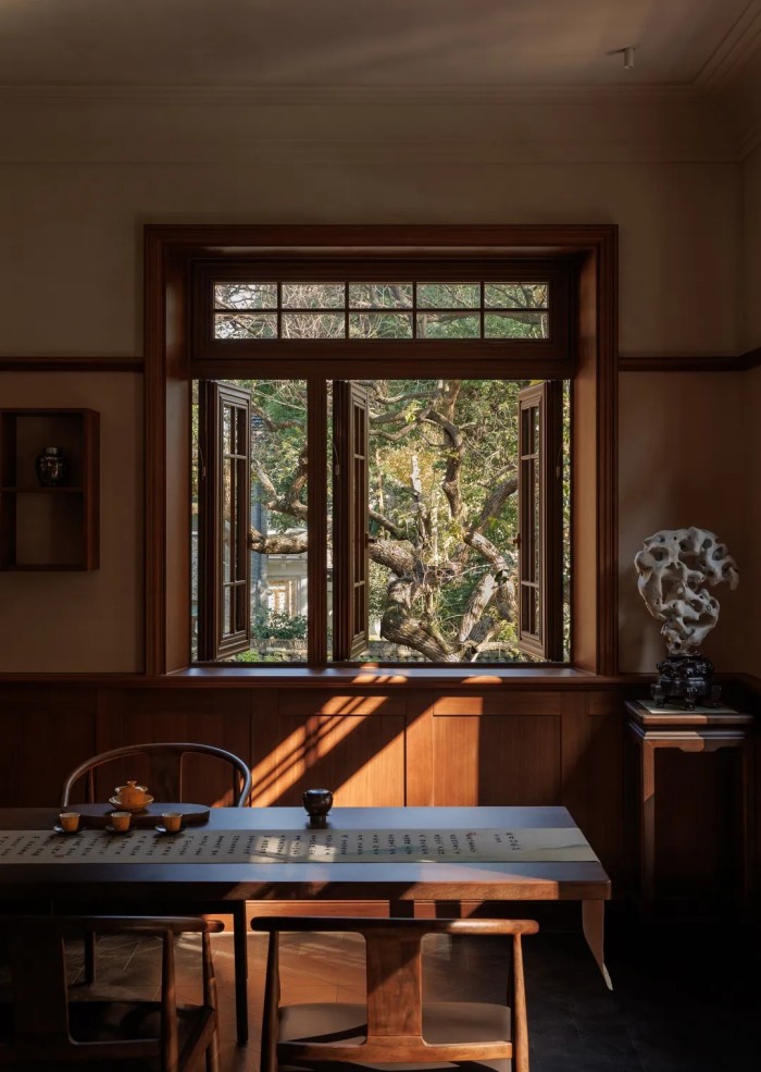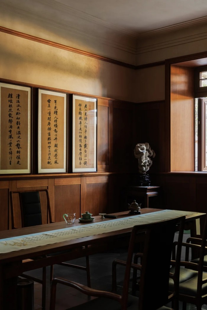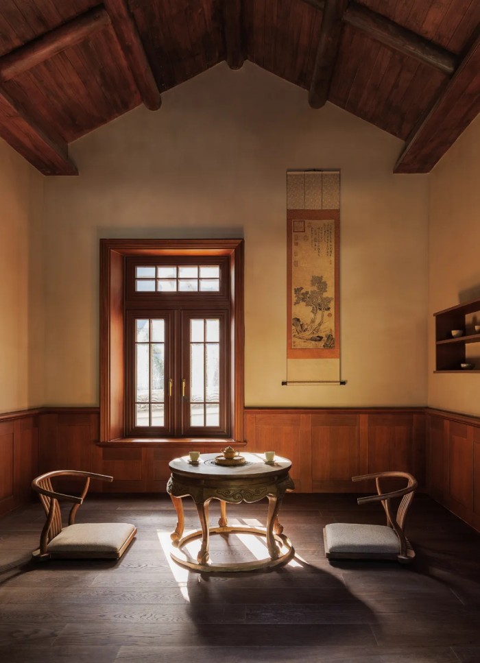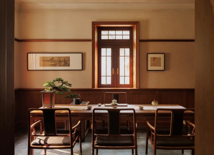 定位經(jīng)營中國頂尖茶。盡管當(dāng)下的茶空間多以東方禪意為主,結(jié)合古建筑的強(qiáng)規(guī)要求,我們選擇順應(yīng)自然,修舊如舊,保持經(jīng)典的民國建筑風(fēng)貌。在空間中,盡力創(chuàng)造與茶人共融的克制與純粹為設(shè)計核心。