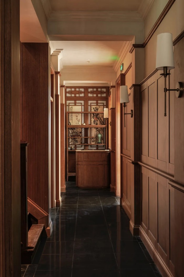公共區(qū)域的地面采用了金磚,質(zhì)樸中透著古韻;包廂采用煙灰復(fù)合地板拼花,仿佛空間中依舊隱約漂浮著民國的氣息。