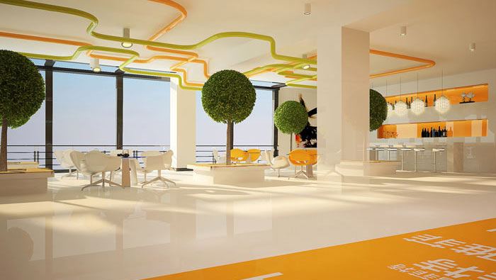 前臺的設(shè)計(jì),設(shè)計(jì)師在設(shè)計(jì)的時(shí)候,對空間采用極簡的設(shè)計(jì)手法,在設(shè)計(jì)師看來越是簡潔的空間對于人的視覺越有吸引力,同時(shí)設(shè)計(jì)師采用白色讓空間向四周散開,以此擴(kuò)張空間的視覺效果,橘黃色重點(diǎn)在于突出整個(gè)空間的聚集點(diǎn)。