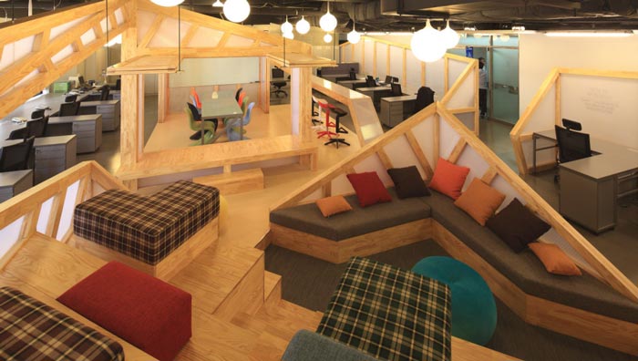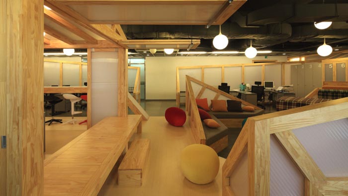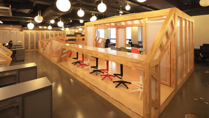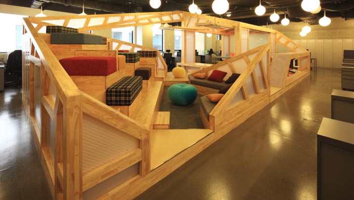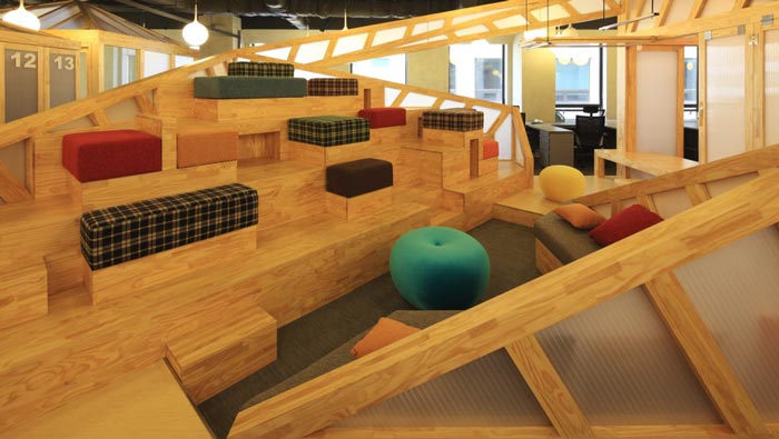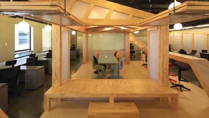 會議室的設計:設計師在設計的時候,將其安置在空間的中心區(qū)域,將此處做為中心來設計,在設計師看來會議室是一個企業(yè)進步的階梯,在此地員工自由發(fā)揮、暢所欲言,有的坐在吧臺區(qū)域、有的坐在木材搭建的休息臺桌上,在和諧的氛圍中大家相互交流,在歡快的氛圍中完成讓員工可以放開心扉,與企業(yè)相互融為一體,感受到自己的責任。