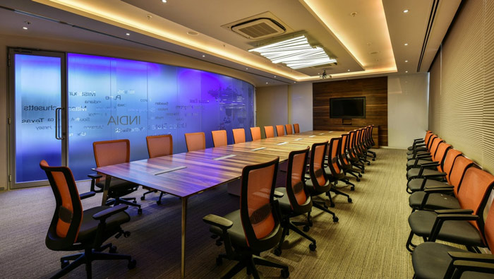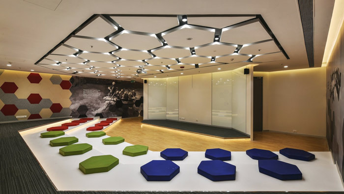 廠房辦公室大會議室設(shè)計:整體看此處是一個不規(guī)則的空間,而設(shè)計師恰恰就是要利用這樣的不規(guī)則,將大會議室完全暴露在開放的空間之中,這樣的目的就是為了突出打破二字,讓員工可以不安套路出牌,讓想法可以得到多方位的發(fā)展。