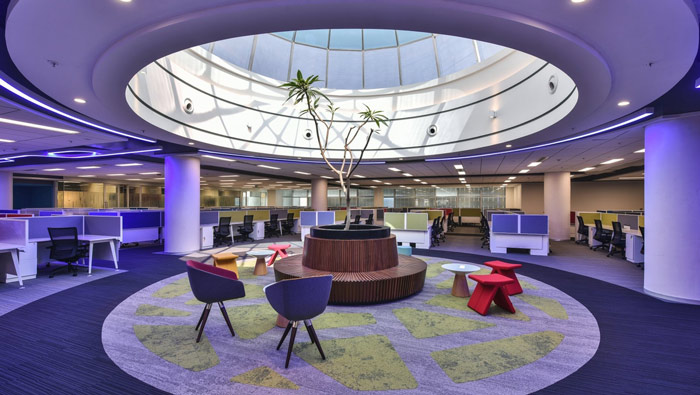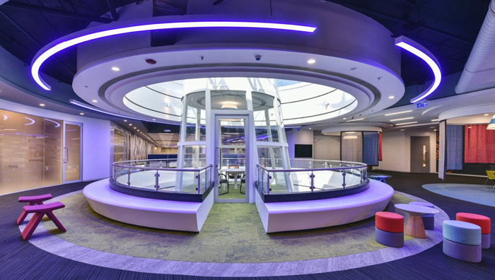 廠房辦公室辦公區(qū)休息區(qū)設(shè)計:整個辦公空間按照一個圓形分布,陽光透過上部圓形的造型四面射入空間,將照入室內(nèi)的陽光最大化,同時此處也給人很強(qiáng)的科技感,好似宇宙飛船降落的那一瞬間。