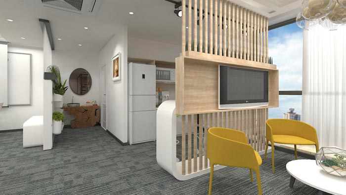 進(jìn)門區(qū)域的設(shè)計(jì),設(shè)計(jì)師在設(shè)計(jì)的時(shí)候,將進(jìn)門空間以6:4的比例將空間劃分開(kāi)來(lái),4為進(jìn)門區(qū)域、6為接待區(qū)域,設(shè)計(jì)師希望以過(guò)渡將企業(yè)品牌設(shè)計(jì)在隔斷墻上,讓客戶可以對(duì)企業(yè)有一個(gè)初步的認(rèn)知。