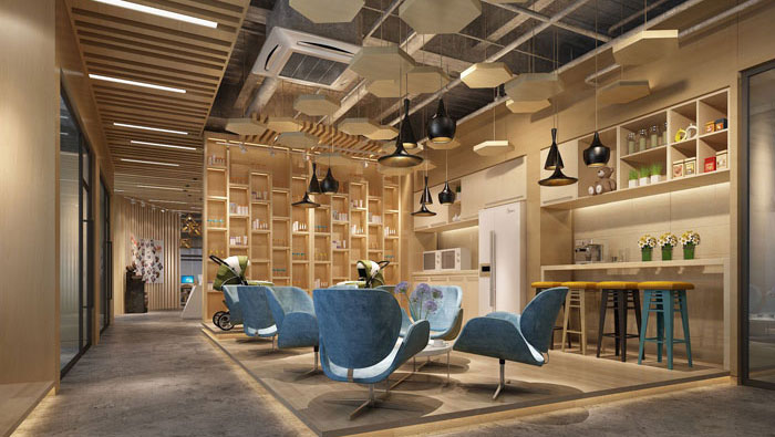 茶水間的設計,設計師主要以原木隔斷和原木展柜為主,將空間打造成舒適、溫馨的空間,在日益競爭的社會壓力中,為員工起到緩沖、減壓的作用。