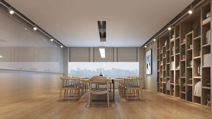 會議室的設計:設計師在設計的時候,主要目的就是擴大空間的承載能力,因為企業(yè)對于會議室有強制性的要求,就是需要可以承載足夠的員工,故此設計師對空間采用了大刀闊斧的改革,以定制的會議桌【長大于寬】,以此來貫穿整個空間,同時將空間兩側加以利用,以求達到空間承載能力的最大值。