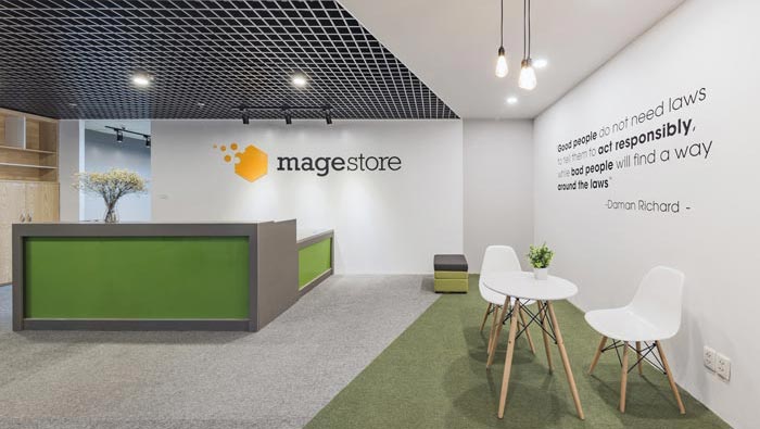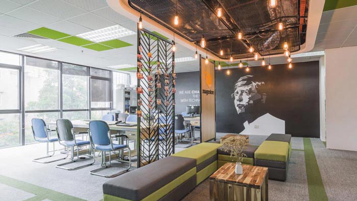 電子商務(wù)辦公室前臺設(shè)計:設(shè)計師在設(shè)計的時候,在主色調(diào)的選擇上采用白色,在設(shè)計師看來白色可以兼容所有的色彩,同時白色本身有向外散發(fā)的特性,設(shè)計師希望借用這種特性,讓前臺在視覺上趨于分散,以此奠定各個區(qū)域位置的分布,同時綠色、淺綠色的設(shè)計,讓各個區(qū)域涇渭分明。
