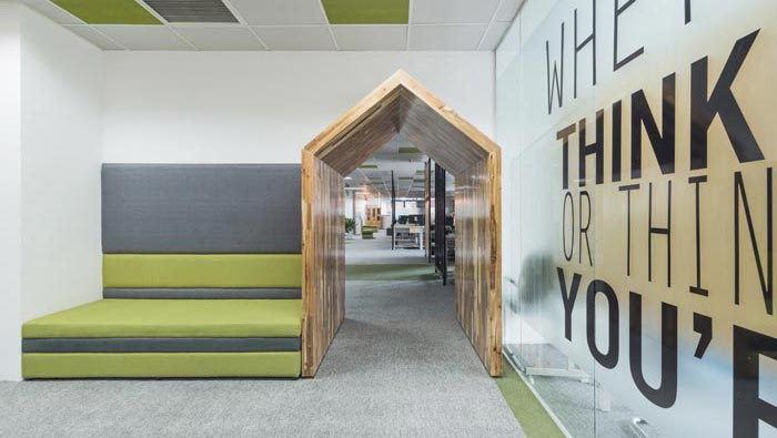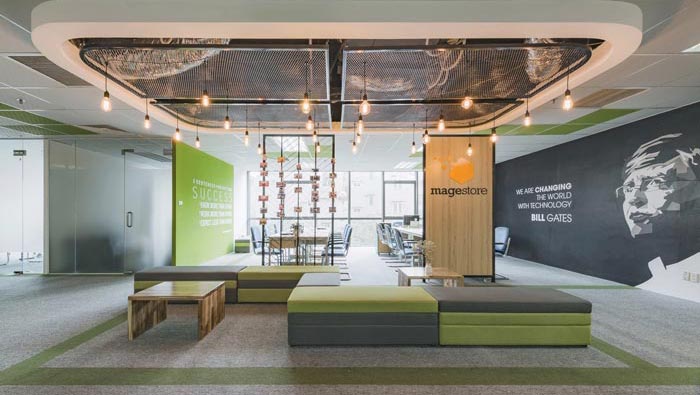 電子商務(wù)辦公室休息區(qū)設(shè)計:設(shè)計師在設(shè)計的時候,將其安置在一個真空區(qū)域,之所以說是真空區(qū)域,是因為此處處于動線的盡頭,設(shè)計師希望此處可以保持通暢,以此避免對整個空間造成影響,另一方原因就是此處的采光極好、環(huán)境也極其安靜,在此處員工可以脫離工作的壓力,在此處放空自己。