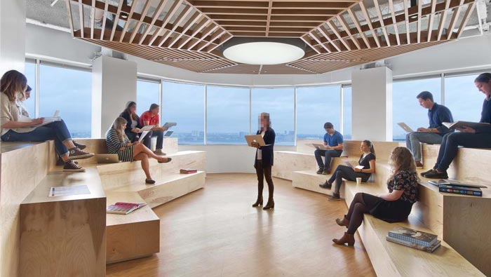 匯報(bào)區(qū)域的設(shè)計(jì):此處是一個(gè)環(huán)形空間,這樣的空間是一個(gè)天然的匯報(bào)區(qū)域,因?yàn)榭臻g的兩邊可以設(shè)置成類似足球場(chǎng)看臺(tái)的層疊式座椅,這樣可以增加空間的容納能力,同時(shí)類似三角的設(shè)計(jì)自然的向內(nèi)聚集有利于匯報(bào),同時(shí)中間區(qū)域被設(shè)計(jì)師空置出來(lái),可以留給匯報(bào)人,讓匯報(bào)更充滿新意。