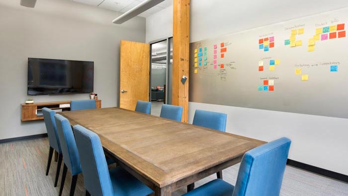 會議室的設(shè)計:在設(shè)計中設(shè)計師有意的縮小了會議桌的面積,在設(shè)計師看來只要夠用就可以沒必要過于浪費,設(shè)計師的重點在于釋放空間的壓力,也就是釋放更多的空白空間,以此在會議開展的時候為企業(yè)帶來更多的想象空間,想象空間就是希望讓大家靜下心來認(rèn)真思考,同時也為大家提供了踱步的空間,希望通過動與靜之間的互換達到快速解決問題的作用。