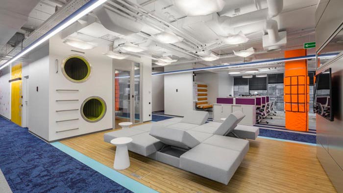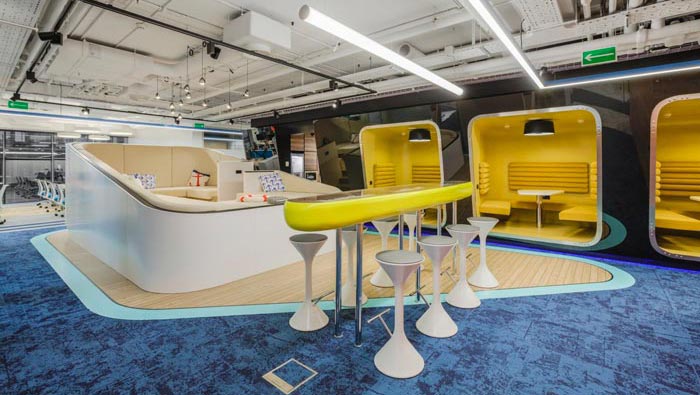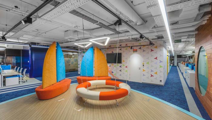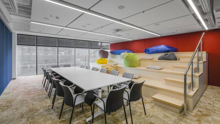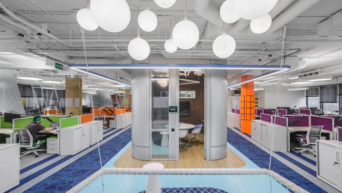 辦公區(qū)域的設(shè)計:設(shè)計師在設(shè)計的時候,將辦公區(qū)安置在空間的兩側(cè),中間部分主要以洽談、休息為主,同時在辦公區(qū)域設(shè)置的同時,利用色彩的轉(zhuǎn)變來區(qū)分部門的位置,每一個部門之間都有一定的緩沖地帶,這樣做的目的就是希望在開放的空間內(nèi)保留員工的私人空間。