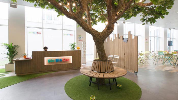 前臺(tái)的設(shè)計(jì):設(shè)計(jì)師以自然——樹(shù)為設(shè)計(jì)的前提,將樹(shù)移植在空間之中,設(shè)計(jì)師的想法就是以綠色來(lái)表現(xiàn)企業(yè)的服務(wù),讓客戶進(jìn)入后感覺(jué)到眼前一亮,但又不會(huì)感到突兀,在樹(shù)根處以一圈圓形地毯、圓形座椅包圍,讓客戶在樹(shù)下休息可以感受到自然的氣息,綠色的地毯在設(shè)計(jì)師的裁剪下形成一個(gè)動(dòng)線的外圍,形成了宛若天成的動(dòng)線起到指引的作用。