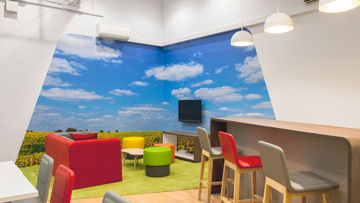 ? 休息區(qū)域的設(shè)計(jì):設(shè)計(jì)師在設(shè)計(jì)的時(shí)候,將其安置在空間的一個(gè)角落區(qū)域,設(shè)計(jì)師希望在室內(nèi)為員工打造一片凈土,在此地沒有壓力、沒有束縛,設(shè)計(jì)師為了達(dá)到這個(gè)目的,故此在設(shè)計(jì)中采用墻紙的具象使的外景得以在室內(nèi)重現(xiàn)。