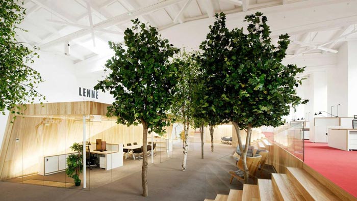 童裝公司辦公室進(jìn)門區(qū)設(shè)計(jì):進(jìn)入空間后首先看到的就是一排排樹木向內(nèi)延伸,這樣的設(shè)計(jì)讓人眼前一亮,空間的空氣也格外清新,讓人完全感受不到這是在是室內(nèi),設(shè)計(jì)師希望在客戶心中留下不錯(cuò)的第一印象。
