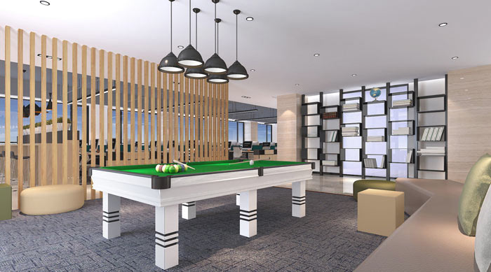 接待區(qū)域、娛樂區(qū)域的設計:設計師在設計的時候,與業(yè)主在此處進行了詳細的交流,在設計師與業(yè)主看來此處應該打破常規(guī),讓客戶把等待變成有趣的等待,故此將書架與臺球桌安置在此處,讓客戶在等待中可以度過一個不一樣的時光。