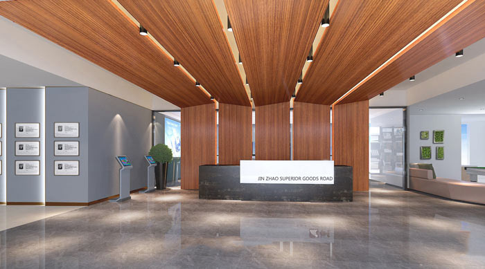 前臺空間的設計:設計師在設計的時候,采用木飾面在空間中形成坐標式的設計,設計師希望讓客戶在進入空間后,通過坐標的引導可以直接尋找到空間的重點(企業(yè)品牌),以此形成空間的聚焦作用,不會因為開放式的設計使空間產(chǎn)生分散的副作用。