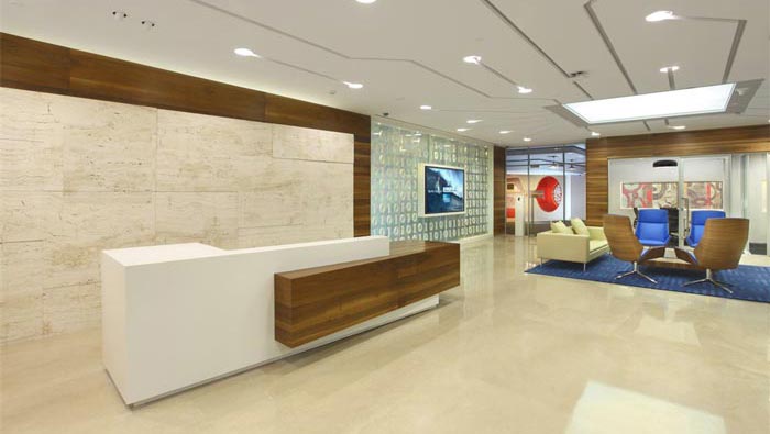 前臺區(qū)域的設(shè)計:設(shè)計師在設(shè)計的時候,將前臺空間劃分為前臺、接待、動線,在設(shè)計師看來前臺以極簡進(jìn)行表現(xiàn)與設(shè)計,這樣可以使客戶在第一時間清晰了解企業(yè)的屬性,同時接待區(qū)的設(shè)計以溫馨、舒適為原則,在細(xì)節(jié)上體現(xiàn)企業(yè)以人文本的原則,動線將各個空間相互連通,起到橋梁的作用。