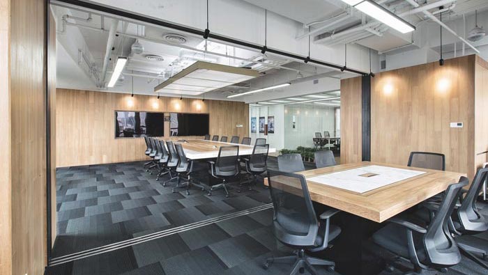 會議室的設計:設計師在設計的時候,打算設計一個小會議室與小會議室結合的會議空間,大會議室安置在空間的內部,小會議室安置在空間的外側,兩者之間呈一條直線分布,這樣布局的好處就是為空間預留了足夠的活動空間,活動空間與動線相互結合在一起,既保證了空間的通暢又保證了空間的正常運行。