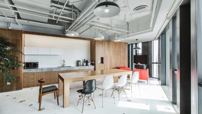 茶水間的設計:設計師在設計的時候,將其安置在空間的一個角落區(qū)域,此處呈三角形分布,設計師在設計中將茶水柜安置在空間三角的一條直線上靠墻分布,這樣的好處就是可以為空間留下足夠的使用空間,其中分布有休息桌椅、電視柜、沙發(fā)等,這樣可以讓員工在此地得以放松與歸零。