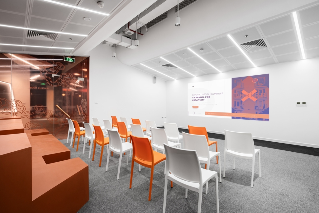 相反,我們保持個(gè)人工作空間的開(kāi)放、干凈和簡(jiǎn)單,主要顏色是白色和灰色,沒(méi)有墻壁,也沒(méi)有私人房間來(lái)表達(dá)團(tuán)隊(duì)的透明文化。我們?yōu)樗械臅?huì)議室和培訓(xùn)室使用了帶有品牌色彩標(biāo)記的玻璃隔板,以保持透明,但仍然足夠私密。最后但并非最不重要的一點(diǎn)是,空間的亮點(diǎn)是用條紋眼鏡設(shè)計(jì)的透明樹(shù)盒,這就造成了樹(shù)木內(nèi)部模糊的效果。這些框也被用來(lái)劃分部門(mén),而不是使用標(biāo)志,使工作空間更有趣。