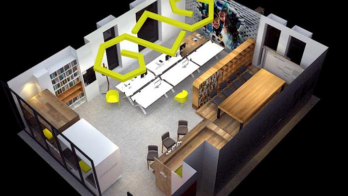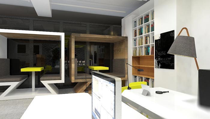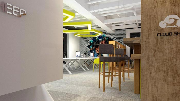 工作室設(shè)計:進門區(qū)域的設(shè)計,設(shè)計師在設(shè)計的時候,利用夾角對前臺進行設(shè)計,夾角一來可以使客戶看到空間的一個大致狀況,讓客戶對內(nèi)部空間充滿好奇,二來夾角利用企業(yè)品牌的展現(xiàn),夾角本身的特性決定360度在此處無法展開,這樣也使企業(yè)品牌在此處可以全方位得以展示。
