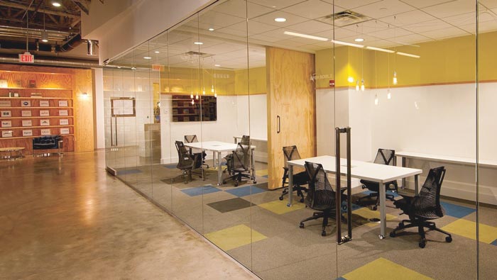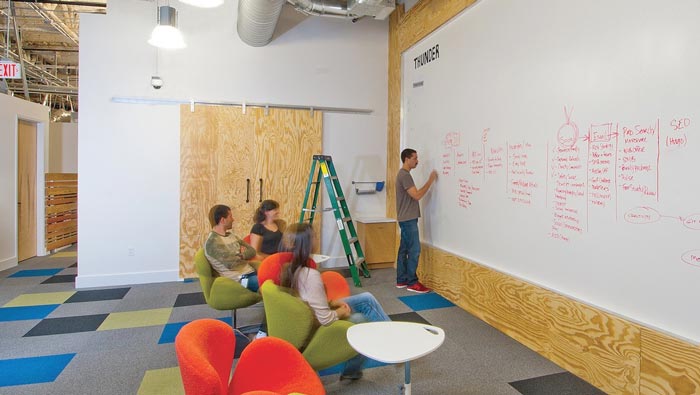 ? 交流區(qū)域的設(shè)計(jì):設(shè)計(jì)師在設(shè)計(jì)的時(shí)候,考慮到企業(yè)的特殊性,故此設(shè)計(jì)師在設(shè)計(jì)中以教室的形式對(duì)此地進(jìn)行設(shè)計(jì),在設(shè)計(jì)師看來(lái)這樣的設(shè)計(jì)讓員工的交流更加順暢,同時(shí)巨大的板報(bào)讓員工可以將問(wèn)題細(xì)致化,將問(wèn)題訴之于文字,員工之間相互討論、相互交流。