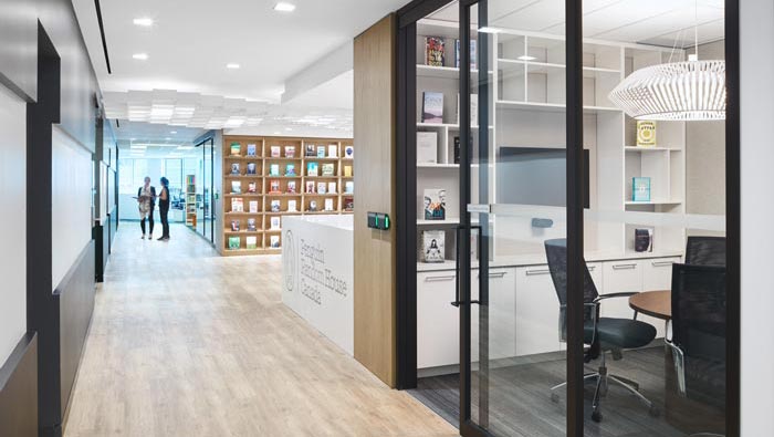 過(guò)道閱讀區(qū)域的設(shè)計(jì):設(shè)計(jì)師在設(shè)計(jì)的時(shí)候,在過(guò)道靠近閱讀區(qū)域的一側(cè)利用隔斷柜做為墻體,將其與墻體合二為一,閱讀區(qū)域是開(kāi)放式的,但是設(shè)計(jì)師希望通過(guò)硬裝與軟裝的結(jié)合提升空間的容納能力,即展示了企業(yè)的產(chǎn)品,又方便了客戶對(duì)于書(shū)籍的需求,讓書(shū)籍更加貼切客戶,讓他們支架不分彼此。