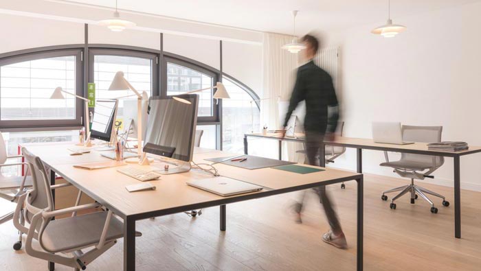 辦公桌的設(shè)計(jì):在辦公桌的選擇上面,設(shè)計(jì)師采用比例等同的辦公桌拼湊而成,雖是拼湊但設(shè)計(jì)師對(duì)于桌面的排列也有一定的建議,上圖為設(shè)計(jì)師的推薦排列方式,這樣的排列方式讓桌面十分整潔,且又能滿足辦公的基本需求,以點(diǎn)擊面可以感受到空間的整潔與簡(jiǎn)潔。