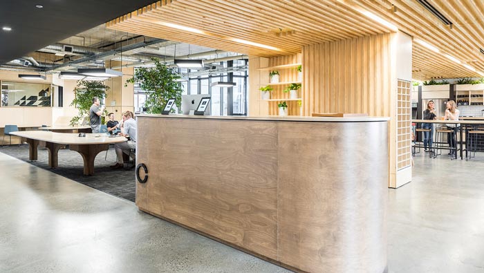 節(jié)能公司辦公室前臺設計:前臺位于整個辦公空間的中心區(qū)域,這樣設計的好處就是為空間同時增添了多條進出口,設計師這樣做的目的,就是要打破空間之間的界限,讓辦公更加自由。