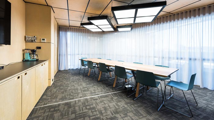 節(jié)能公司辦公室會議室設計:整個空間是個類似于梯形的空間,空間的一面全部都是落地窗,在這里完全可以俯視城市美麗的景色,這也正是設計師為會議額外準備的,讓大家煩躁的心重新安靜下來。